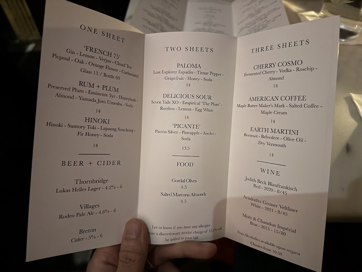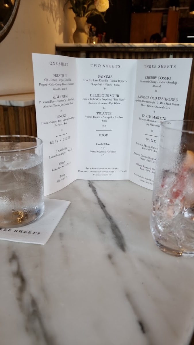 Welcome to Three Sheets Dalston, an intimate cocktail haven nestled on Kingsland Road, London. This minimalist bar stands out with its thoughtfully curated menu, featuring signature cocktails like the RumPlum and Hinoki, each priced at a reasonable £14. The ambiance is inviting, with dim lighting and an eclectic music selection that sets the perfect backdrop for a relaxed evening.